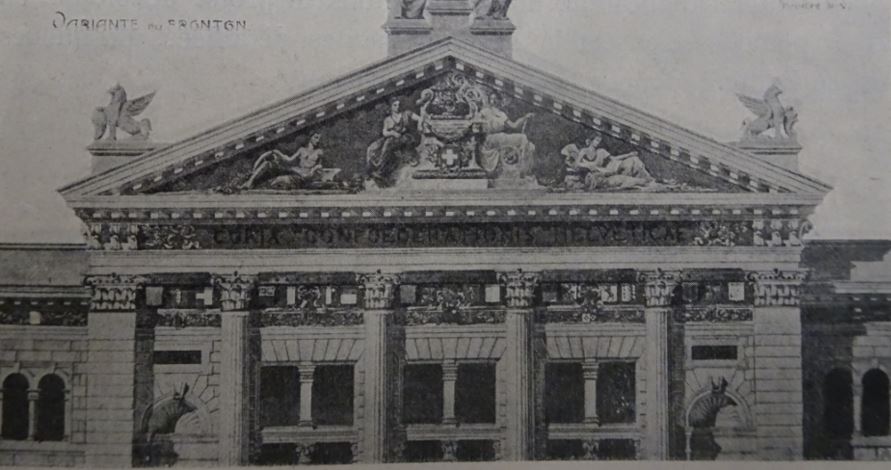 Mais le plan d'exécution qui est soumis au Conseil fédéral en 1894, neuf ans après cette affirmation, propose pour le tympan une allégorie des 22 cantons de l’époque.