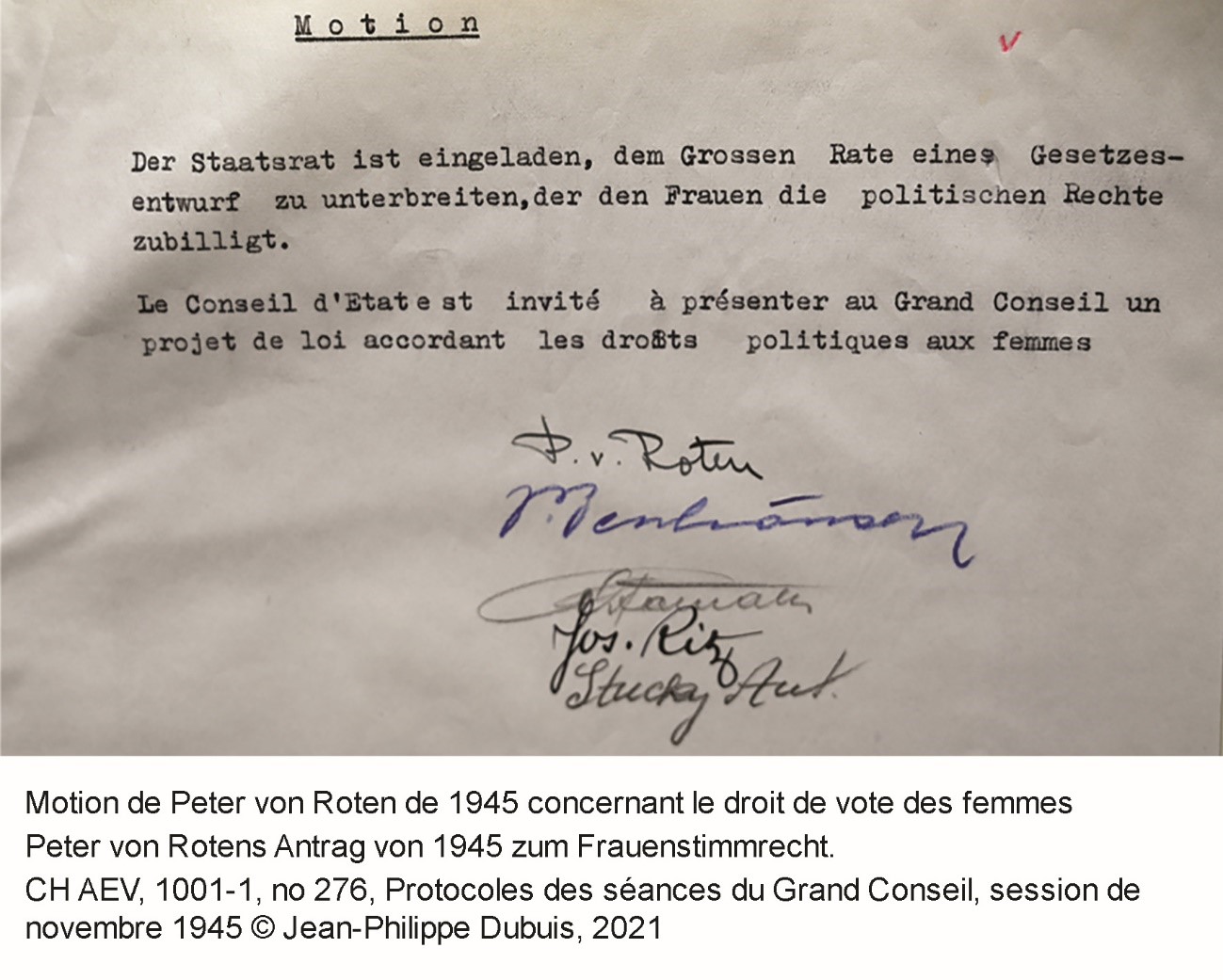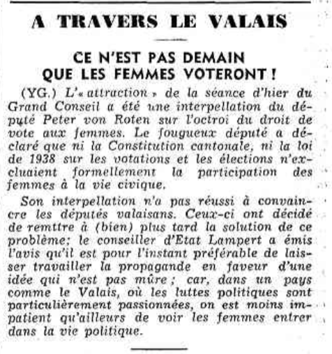 Im Wallis hat Peter von Roten 1945 auch nicht mehr Glück. Seine Partei, die Katholisch-Konservativen, welche die Mehrheit im Grossen Rat stellen, wollen nichts von seiner Motion zugunsten der politischen Rechte für Frauen wissen.