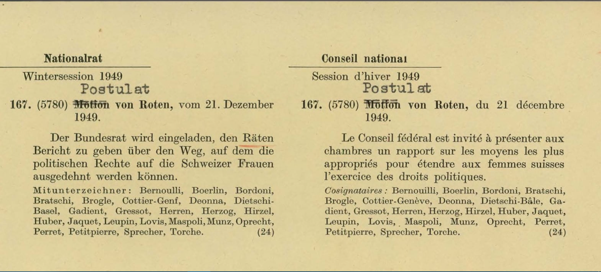 Diese Niederlage bringt allerdings Bewegung in die Sache: Im Dezember 1948 zieht der konservative Feminist in den Nationalrat ein und verliert dort keine Zeit. Peter von Roten reicht ein von 24 Ratsmitgliedern aller Parteien unterzeichnetes Postulat ein, welches den Bundesrat ersucht, «Bericht zu geben über den Weg, auf dem die politischen Rechte auf die Schweizer Frauen ausgedehnt werden können». Dieser Vorstoss wird mit 71 zu 42 Stimmen klar angenommen.
