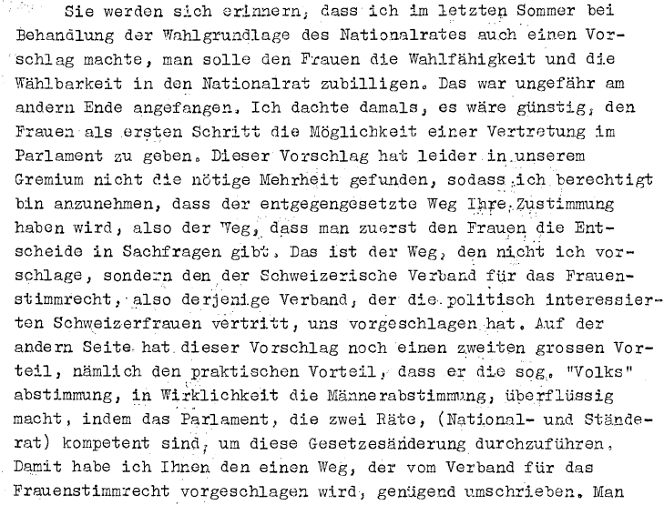 «Sie werden sich erinnern, dass ich im letzten Sommer bei der Behandlung der Wahlgrundlage des Nationalrates auch einen Vorschlag machte, man solle den Frauen die Wahlfähigkeit und die Wählbarkeit in den Nationalrat zubilligen. Das war ungefähr am anderen Ende angefangen. Ich dachte damals, es wäre günstig, den Frauen als ersten Schritt die Möglichkeit einer Vertretung im Parlament zu geben. Dieser Vorschlag hat leider in unserem Gremium nicht die nötige Mehrheit gefunden, sodass ich berechtigt bin anzunehmen, dass der entgegengesetzte Weg Ihre Zustimmung haben wird, also der Weg, dass man zuerst den Frauen die Entscheide in Sachfragen gibt. Das ist der Weg, den nicht ich vorschlage, sondern der Schweizerische Verband für das Frauenstimmrecht, also der Verband, der die politisch interessierten Schweizerfrauen vertritt, uns vorgeschlagen hat. Auf der anderen Seite hat dieser Vorschlag noch einen zweiten grossen Vorteil, nämlich den praktischen Vorteil, dass er die sog. „Volks“abstimmung, in Wirklichkeit die Männerabstimmung, überflüssig macht, indem das Parlament, die zwei Räte (National- und Ständerat) kompetent sind, um diese Gesetzesänderung durchzuführen. Damit habe ich Ihnen den einen Weg, der vom Verband für das Frauenstimmrecht vorgeschlagen wird, genügend umschrieben. […]»