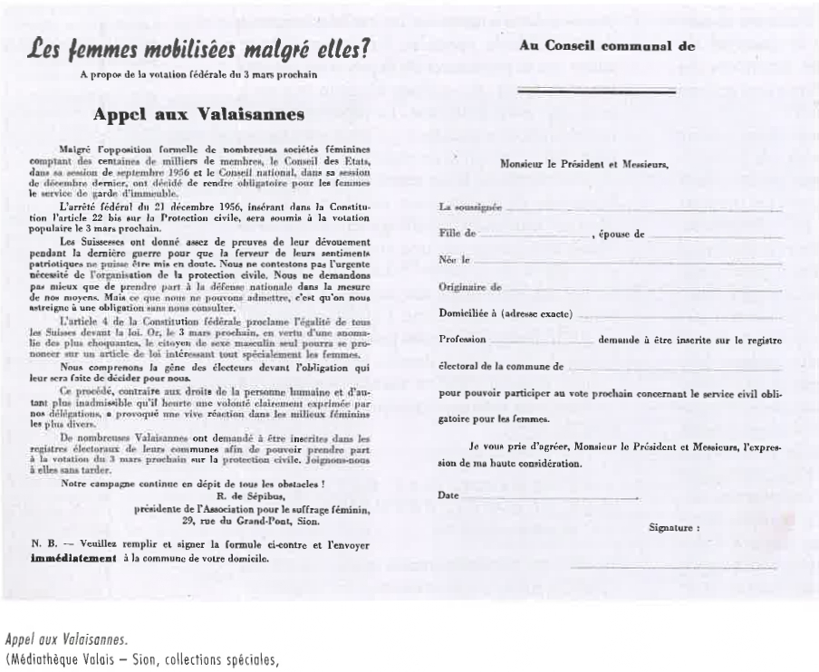 Doch in der Westschweiz und im Tessin haben die Verbände, die sich für das Frauenstimmrecht stark machen, die Frauen bereits aufgerufen, sich in die Wahlregister einzutragen. Einige Gemeinden, so z. B. der Weiler Unterbäch im Oberwallis, akzeptieren dies gegen den Willen des Bundesrates. Hier hat Peter von Roten seine Finger im Spiel: Er besitzt ein Chalet im Dorf und ist ein Kampfgefährte des Gemeindepräsidenten Paul Zenhäusern. Unter dem Blitzlichtgewitter der schweizerischen und internationalen Presse stimmen 33 der 86 Einwohnerinnen von Unterbäch gemeinsam mit den Männern über den Zivilschutz ab.