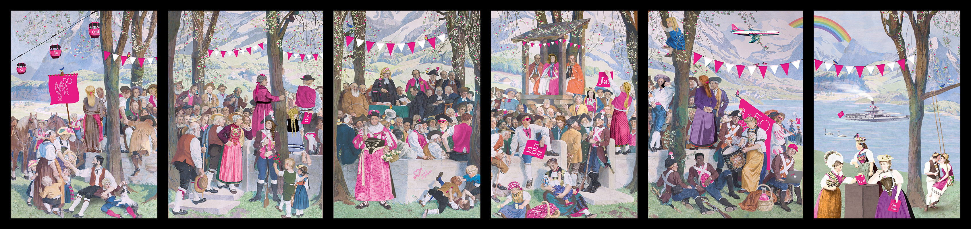 Chaque habitant de ce pays connaît la landsgemeinde du XVIIIe siècle d’Albert Welti et de son ami Wilhelm Balmer qui orne la salle du Conseil des Etats. L’œuvre historique a pris un coup de jeune pour la Journée internationale des droits des femmes. L’artiste designer d’Ollon (VD) Camille Scherrer en a réalisé un trompe-l’œil où l’assemblée est présidée par une femme.