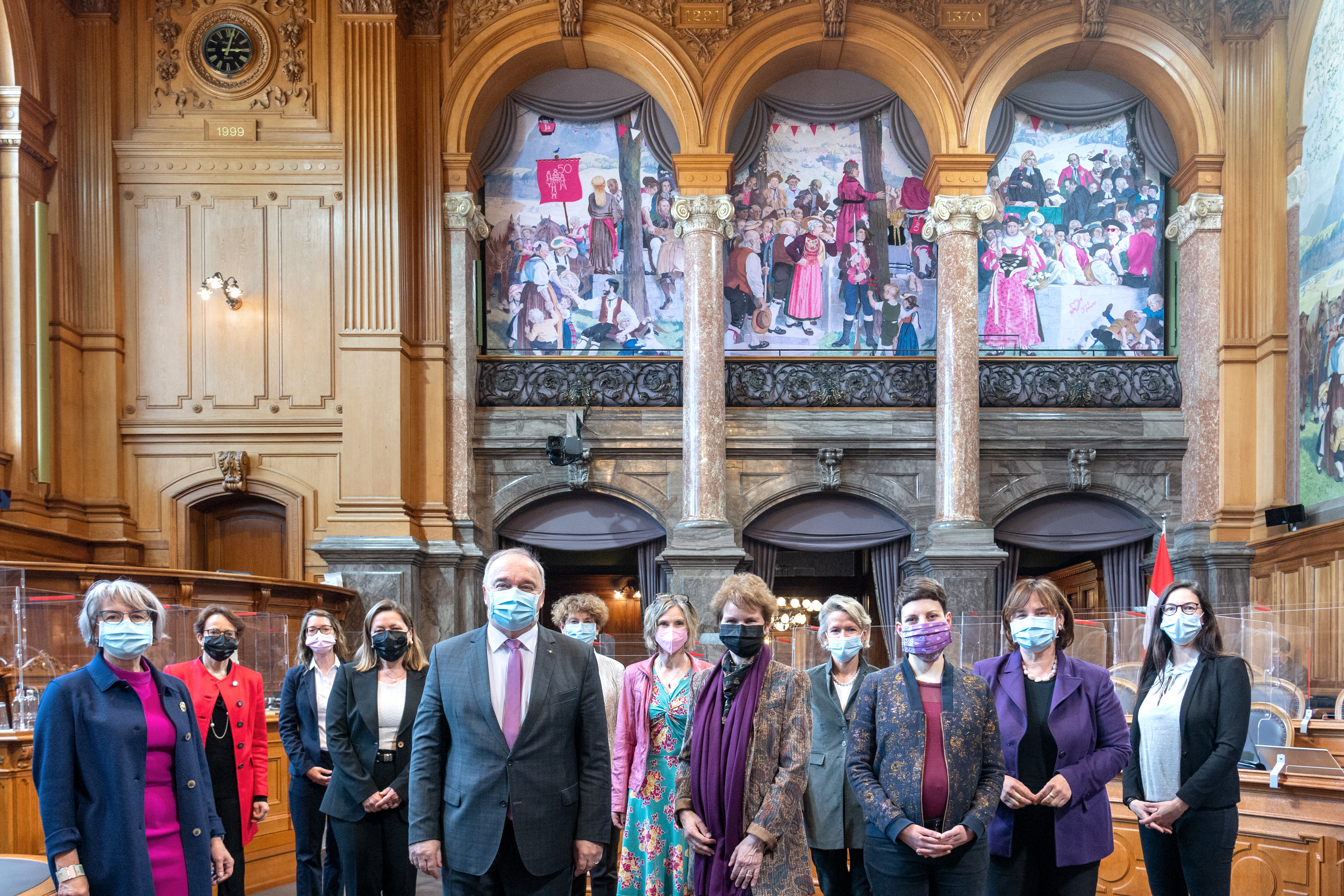 Le président de la Chambre haute Alex Kuprecht a inauguré avec le sourire le trompe-l’œil en ouverture de séance du lundi 8 mars 2021. Il a ainsi réalisé le vœu de trois sénatrices de marquer l’année du jubilé du suffrage féminin.