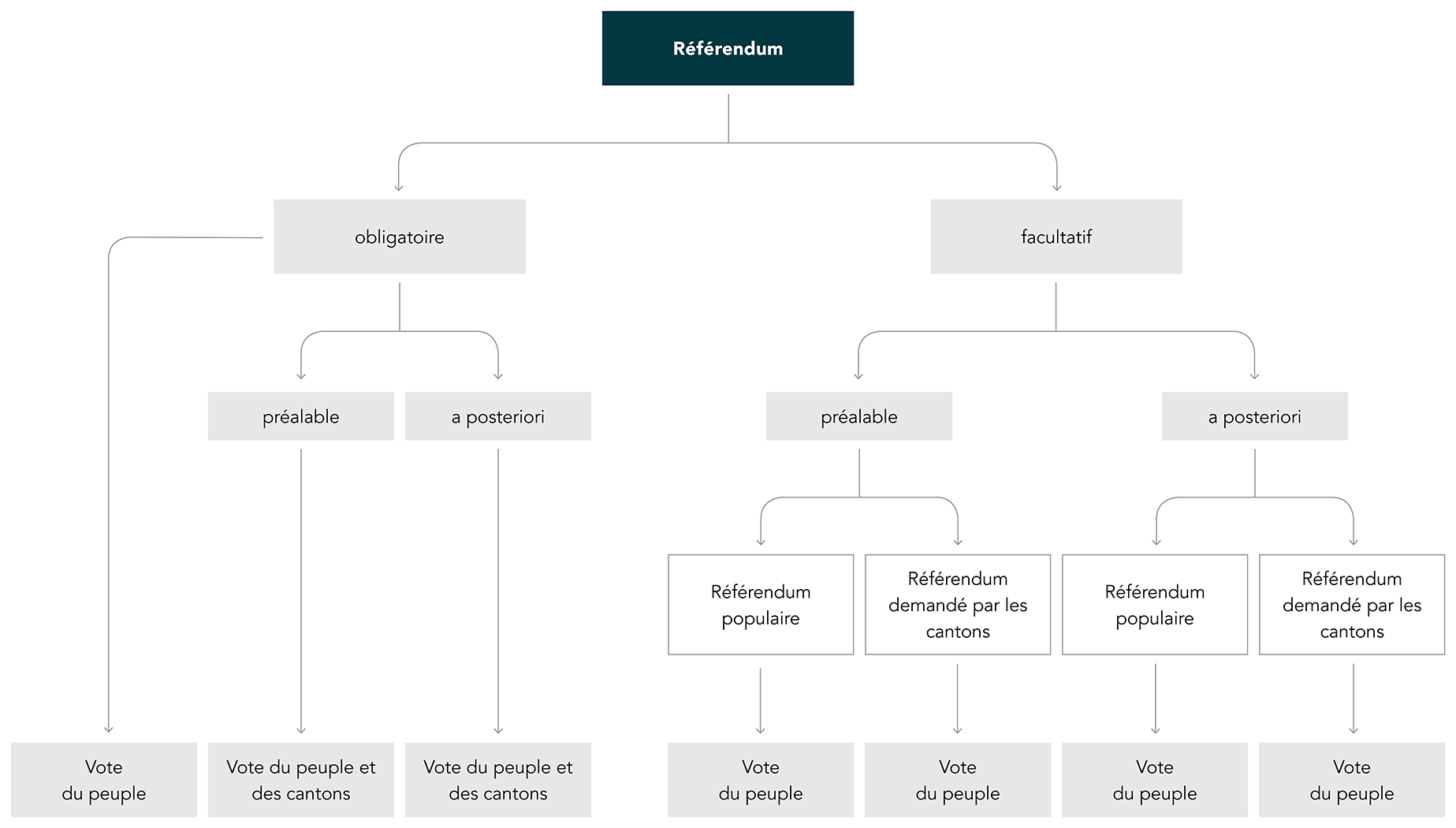 ​La​ Constitution distingue entre le référendum obligatoire et le référendum facultatif (art. 140 et 141 Cst.). Les actes soumis au référendum obligatoire sont automatiquement soumis au vote populaire. Les actes sujets au référendum facultatif sont soumis au vote si la demande en est faite.