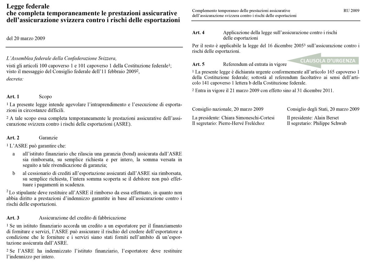 Le leggi federali urgenti sono pubblicate nella Raccolta ufficiale subito dopo la loro adozione. Entrano in vigore il giorno in cui il Parlamento le approva o, di norma, pochi giorni dopo.