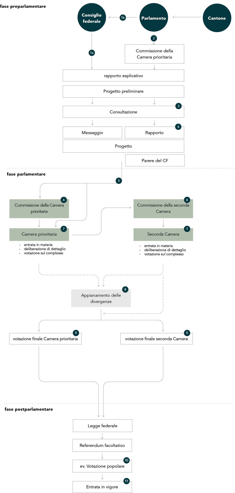 art. 115 segg. LParl). Se si dà seguito a un’iniziativa, la responsabilità di elaborare un progetto di legge federale è affidata alla commissione competente in materia di una Camera e non al Consiglio federale. (Il Popolo non dispone del diritto d'iniziativa legislativa: mediante un'iniziativa popolare può infatti proporre una modifica della
