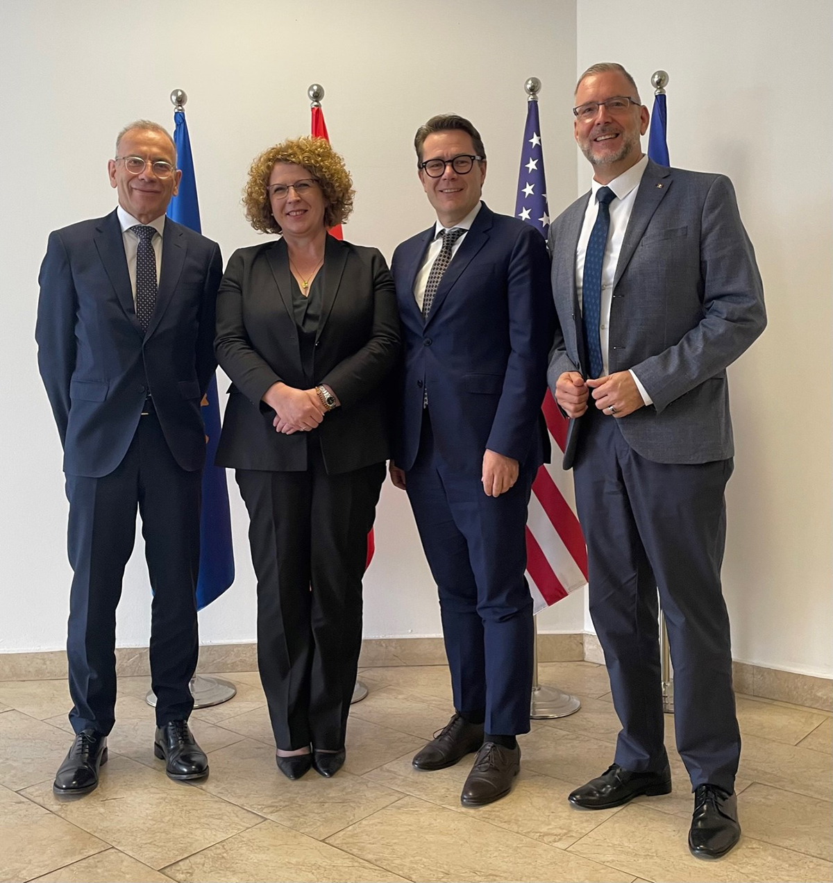 Ständerat Hannes Germann, Handelsministerin Rozeta Hajdari, Delegationspräsident Benedikt Würth und Nationalrat Hans-Peter Portmann (v.l.n.r.).